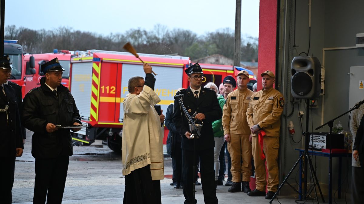 Następnie proboszcz parafii ks. Jerzy Dalak dokonał uroczystego poświęcenia obiektu, a także pojazdów i sprzętu strażackiego. Poświęcona przestrzeń ma odtąd służyć bezpieczeństwu mieszkańców oraz rozwojowi działalności jednostki OSP.