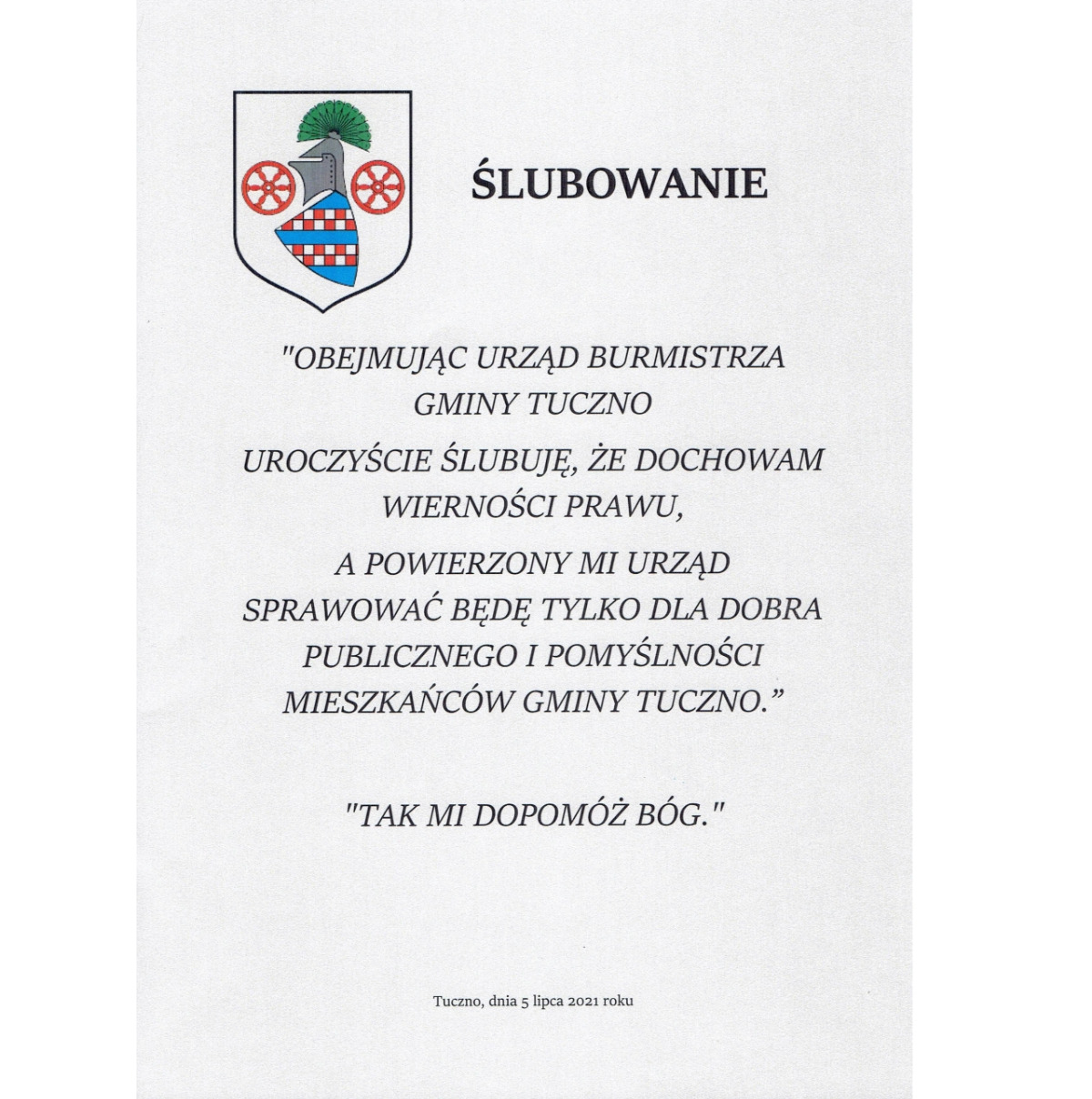 „Obejmując urząd burmistrza Gminy Tuczno, uroczyście ślubuję, że dochowam wierności prawu, a powierzony mi urząd sprawować będę tylko dla dobra publicznego i pomyślności mieszkańców Gminy Tuczno”
